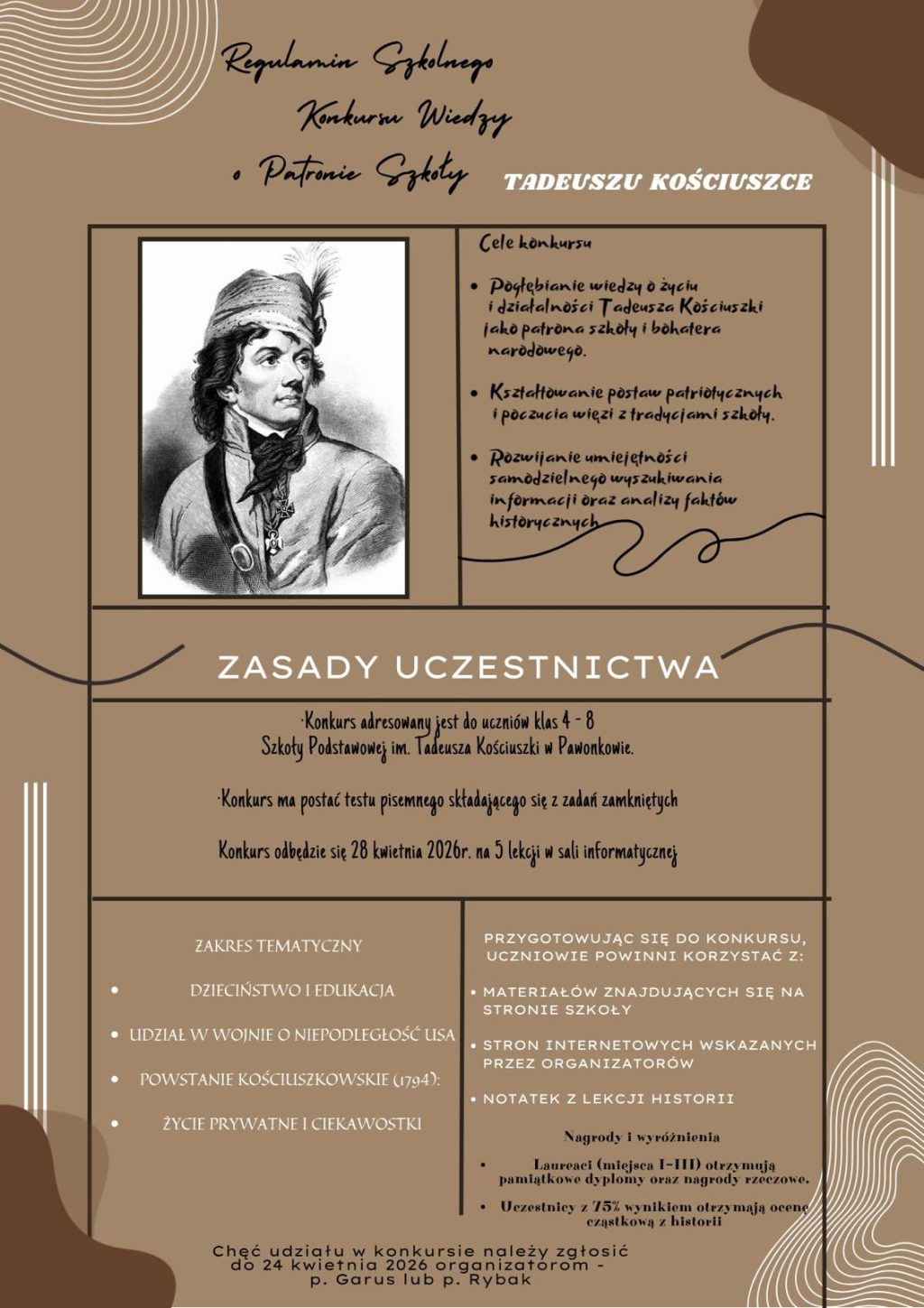 Regulamin konkursu wiedzowego o Tadeuszu KościuszceZapraszamy do udziału uczniów klas 4-8👍