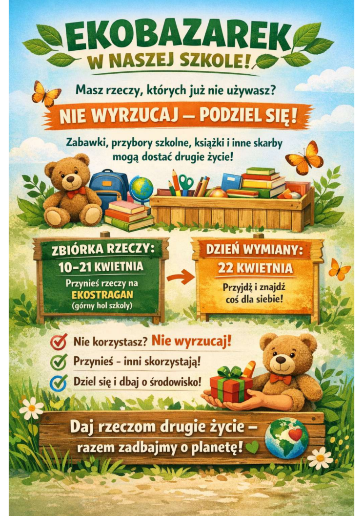 Z okazji nadchodzącego Dnia Ziemi w naszej szkole organizowany jest Eko Bazarek – szkolny punkt wymiany rzeczy używanych i niepotrzebnych, takich jak przybory szkolne, gry, czy zabawki. Akcja odbywa się w duchu zero[…]