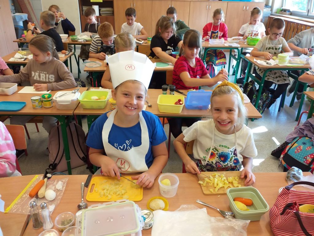 Uczniowie klasy 3 pod kierunkiem pani H. Hacia robili sałatki warzywne. Sałatka była podsumowaniem zajęć o roślinach uprawnych. Dzieci utrwaliły wiadomości o roślinach okopowych, zaśpiewali piosenkę o ziemniaku, rozmawiali o wartościach odżywczych warzyw. Następnie zachowując zasady bezpieczeństwa i dbając o higienę pracy, wykonali smaczne i kolorowe sałatki. Było apetycznie i pachnące.